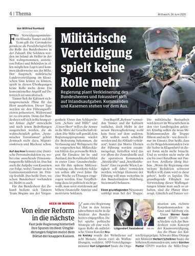 Bundesheer. Die Regierung plant eine Verkleinerung des Bundesheeres und fokussiert sich auf Inlandsaufgaben. Kommanden und Kasernen stehen vor dem Aus. In der Krise habe das Heer aber ein gutes Bild abgegeben. Seiten 4/5 apa