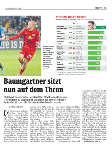 Christoph Baumgartner wechselt für 27 Millionen Euro von Hoffenheim zu Leipzig und ist damit der österreichische Fußballer, für den die höchste Ablöse bezahlt wurde.