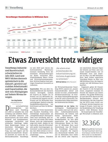 Vorarlbergs Industrie- und Bauwirtschaft schwächelten im Jahr 2023. Land und WKV blicken dennoch optimistisch in die Zukunft, gestützt auf stabilen Arbeitsmarkt und Exportzahlen, die sich trotz Rückgängen auf hohem Niveau bewegen.