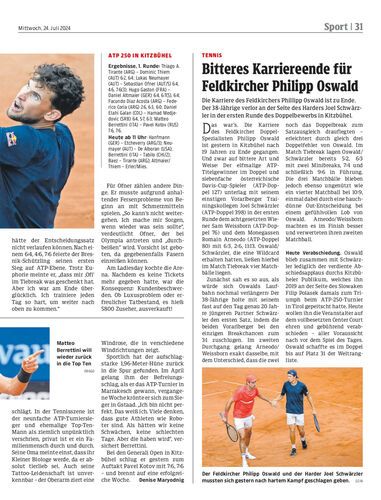 Die Karriere des Feldkirchers Phillipp Oswald ist zu Ende. Der 38-Jährige verlor an der Seite des Harders Joel Schwärzler in der ersten Runde des Doppelbewerbs in Kitzbühel.
