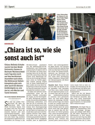 Chiara-Belinda Schuler wartet bei den World University Games in Bochum-Wattenscheid nach Tag eins noch auf den berühmten Ausreißer nach oben. Die Hörbranzer Siebenkämpferin gibt sich aber auch bei diesem Großereignis so, wie sie ist, wie Mutter und Tante betonen.