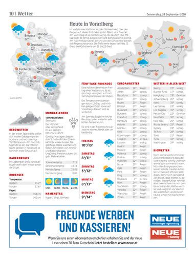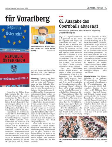 Vorarlberg. Angesichts der hohen Anzahl an Neuinfektionen gilt nun auch Vorarlberg in Deutschland offiziell als Corona-Risikogebiet. Auch Belgien hat die Bundesländer Vorarlberg, Tirol und Wien auf die Liste gesetzt. Seiten 4/5 Hartinger