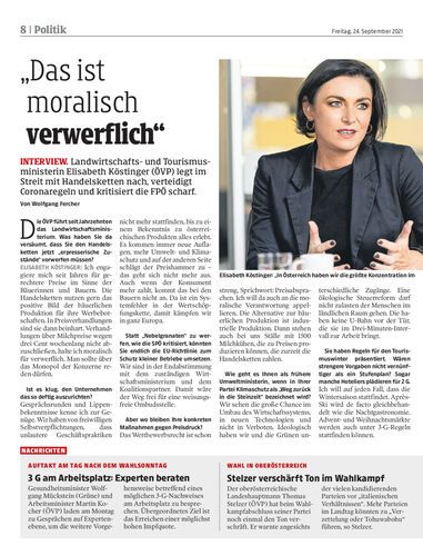 Landwirtschafts- und Tourismusministerin Elisabeth Köstinger (ÖVP) legt im Streit mit Handelsketten nach, verteidigt Coronaregeln und kritisiert die FPÖ scharf. Von Wolfgang Fercher
