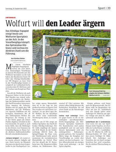 Das Eliteliga-Topspiel steigt heute am Wolfurter Sportplatz an der Ach. In der Vorarlbergliga kämpft das Spitzenduo Hörbranz und Lochau im direkten Duell um die Führung.