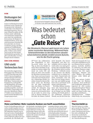 Die Ukrainerin Zhenya Laptii kennt ein Leben unter russischer Besatzung. Während Putin Scheinreferenden in den besetzten ukrainischen Gebieten abhält, erzählt unsere Autorin, wie ihr die Flucht gelang.