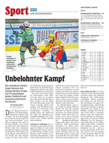 Die Juurikkala-Schützlinge müssen sich Asiago Hockey knapp mit 3:4 geschlagen geben. Feldkirch und Lustenau sind heute im Einsatz.