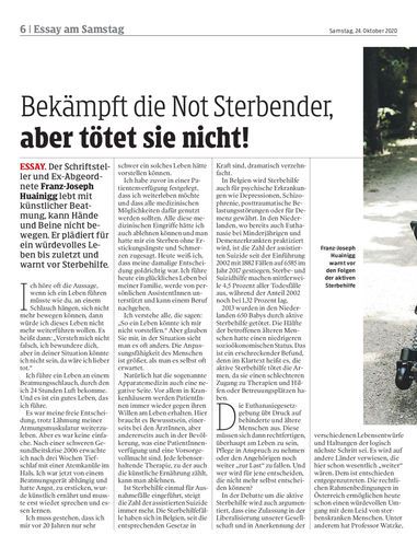 ESSAY. Der Schriftsteller und Ex-Abgeordnete Franz-Joseph Huainigg lebt mit künstlicher Beatmung, kann Hände und Beine nicht bewegen. Er plädiert für ein würdevolles Leben bis zuletzt und warnt vor Sterbehilfe.