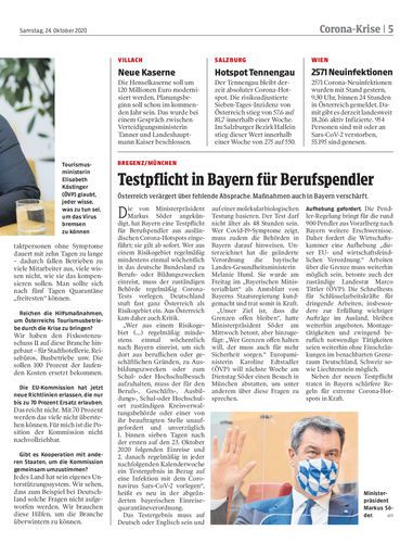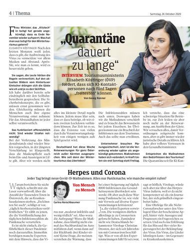 Tourismusministerin Elisabeth Köstinger (ÖVP) fordert, dass sich K1-Kontaktpersonen nach fünf Tagen „freitesten“ können. Von Georg Renner