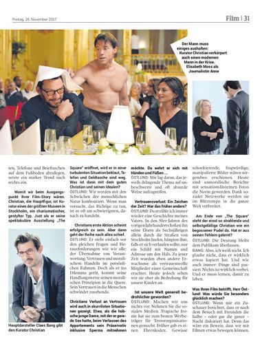Von einem Tag auf den anderen in der Abwärtsspirale: Ein Museumsdirektor wird bestohlen und stolpert danach von einem Wahnsinn in den nächsten. Mit „The Square“ holte sich Regisseur Ruben Östlund heuer die Goldene Palme in Cannes. Von Luigi Heinrich, Berlin