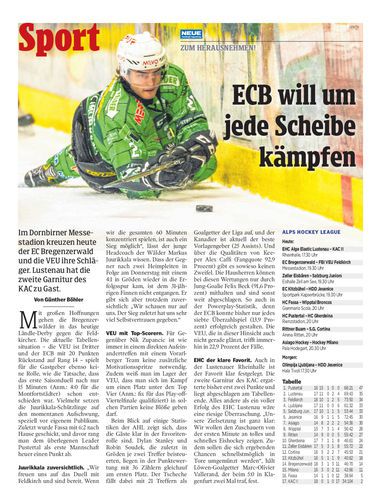 Im Dornbirner Messestadion kreuzen heute der EC Bregenzerwald und die VEU ihre Schläger. Lustenau hat die zweite Garnitur des KAC zu Gast.