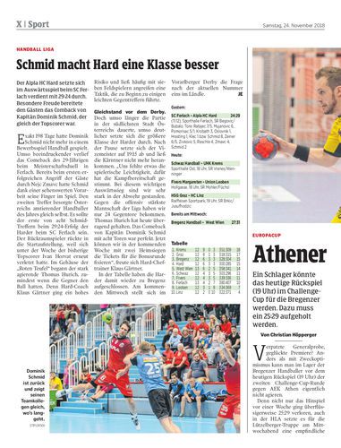 Der Alpla HC Hard setzte sich im Auswärtsspiel beim SC Ferlach verdient mit 29:24 durch. Besondere Freude bereitete den Gästen das Comback von Kapitän Dominik Schmid, der gleich der Topscorer war.
