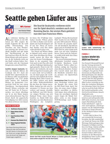 Die Seattle Seahawks verlieren nicht nur ihr Spiel deutlich, sondern auch zwei Running Backs. Der ersten Platz gebührt nun den San Francisco 49ers.