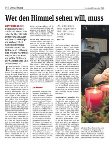 GASTBEITRAG. Der Feldkircher Diözesanbischof Benno Elbs schreibt über die tiefe Bedeutung von Weihnachten. Er verknüpft die Verborgenheit Gottes mit unserer Sehnsucht nach Erfüllung und Hoffnung und erklärt, warum die Geburt Jesu als Kind die größte Einladung zur Nächstenliebe und zum Glauben ist.