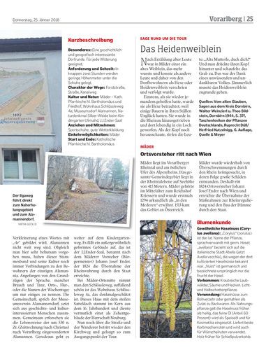 Geschichtenerzählerin Hertha Glück begibt sich ab Ortsmitte Mäder entlang dem Egelseegraben zur Kapelle Rochus in Neuburg, weiters zum Rheindamm. Nach dem Zollamt Mäder vorbei am Alamannendorf wieder zurück zur Pfarrkirche.