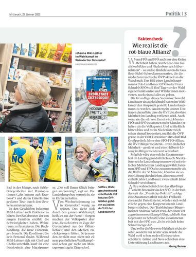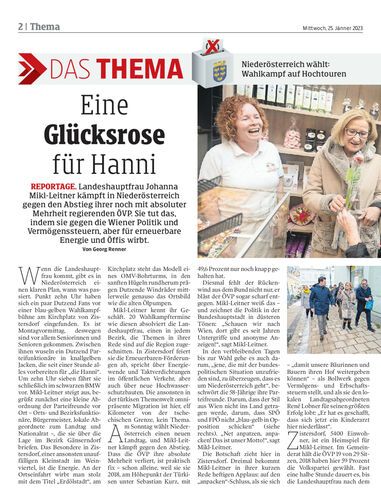 reportage. Landeshauptfrau Johanna Mikl-Leitner kämpft in Niederösterreich gegen den Abstieg ihrer noch mit absoluter Mehrheit regierenden ÖVP. Sie tut das, indem sie gegen die Wiener Politik und Vermögenssteuern, aber für erneuerbare Energie und Öffis wirbt. Von Georg Renner