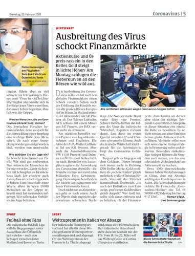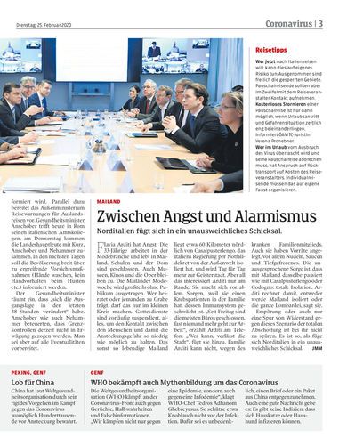 Thema. Nach dem Ausbruch des Coronavirus in Italien herrscht nun auch in Österreich erhöhte Alarmbereitschaft. Panik soll vermieden werden, doch im Hintergrund laufen bundesweit Vorbereitungen für den Ernstfall. Seiten 2–5 AP