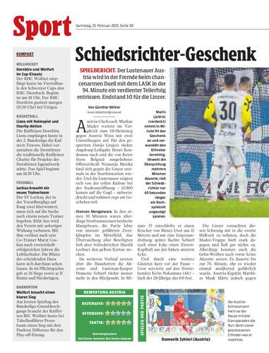 Spielbericht. Der Lustenauer Austria wird in der Fremde beim chancenarmen Duell mit dem LASK in der 94. Minute ein verdienter Teilerfolg entrissen. Endstand 1:0 für die Linzer.