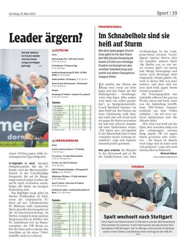 Mit dem Spiel gegen Sturm Graz geht es für das Team der SPG Altach/Vorderland heute (12 Uhr) um wichtige Punkte im Kampf um den zweiten Tabellenrang und somit um einen Champions- League-Platz.
