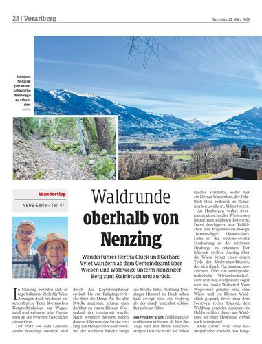 Wanderführer Hertha Glück und Gerhard Vylet wandern ab dem Gemeindeamt über Wiesen und Waldwege unterm Nenzinger Berg zum Steinbruch und zurück.