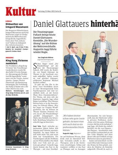 Die Theatergruppe Fußach bringt heute Daniel Glattauers Komödie „Die Wunderübung“ auf die Bühne der Mehrzweckhalle. Augustin Jagg führte wieder Regie.