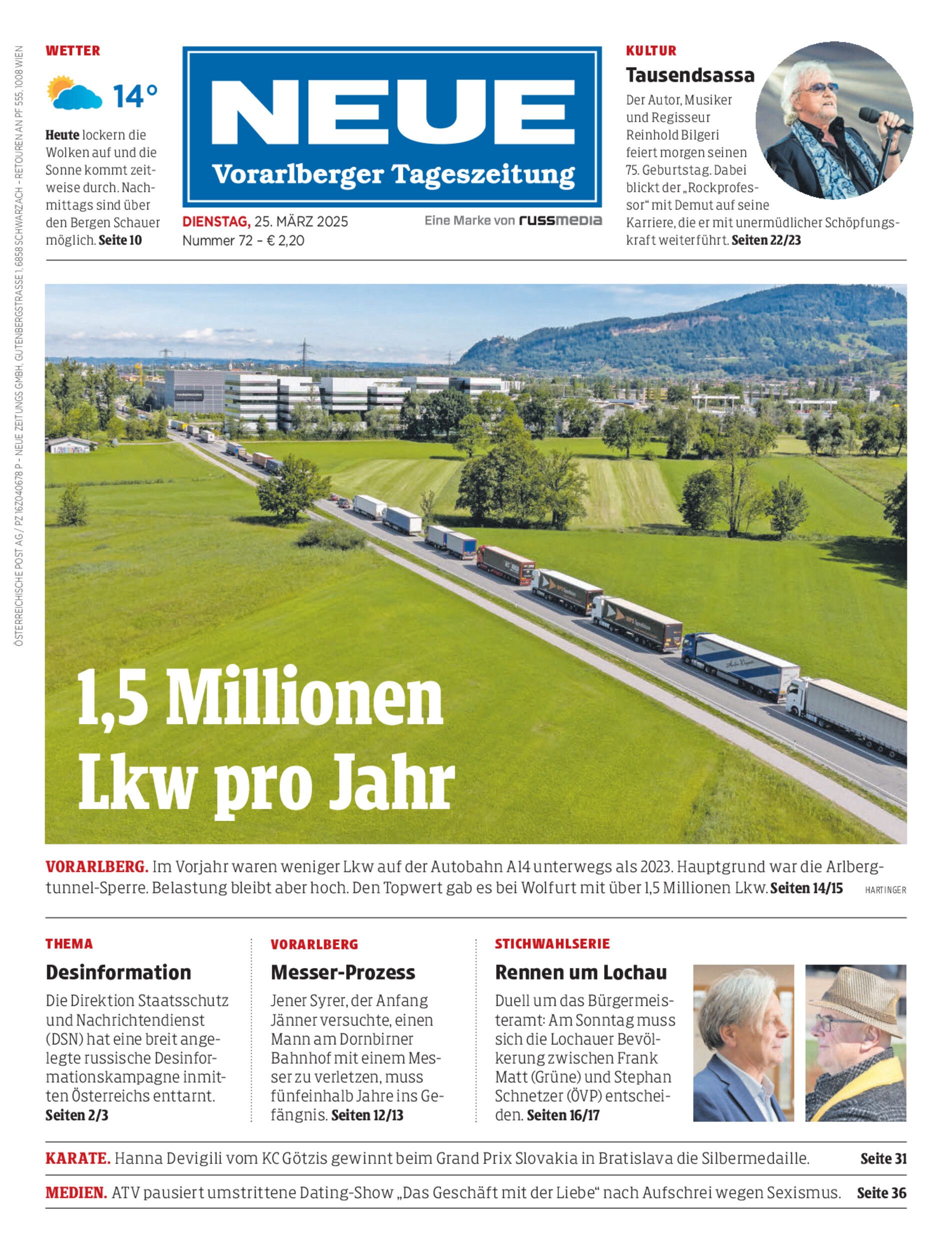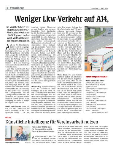 Im Vorjahr fuhren weniger Lkw auf der A14 Rheintalautobahn als 2023. Topwert im Bereich Wolfurt/Lauterach mit 1,56 Millionen.
