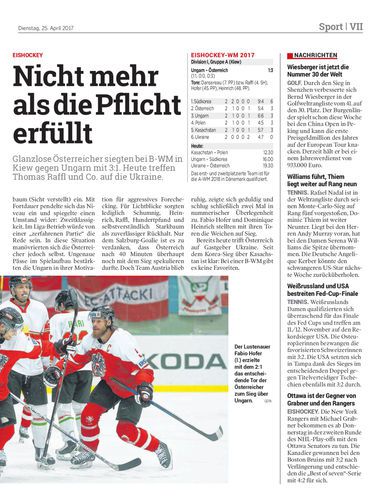 Glanzlose Österreicher siegten bei B-WM in Kiew gegen Ungarn mit 3:1. Heute treffen Thomas Raffl und Co. auf die Ukraine.
