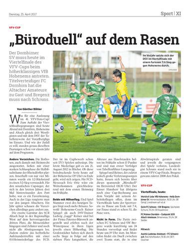 Der Dornbirner SV muss heute im Viertelfinale des VFV-Cups beim höherklassigen VfB Hohenems antreten. Titelverteidiger FC Dornbirn hat die Altacher Amateure zu Gast und Bregenz muss nach Schruns.