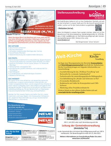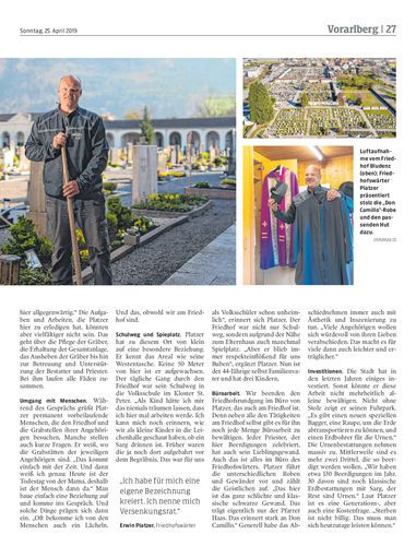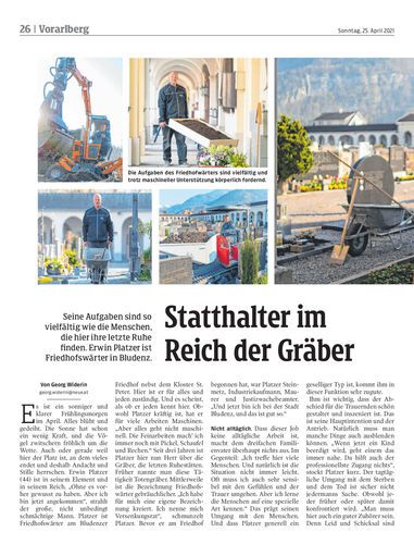 Vorarlberg. Er ist der Statthalter im Reich der Gräber und der Toten. Seine Aufgaben sind so vielfältig wie die Menschen, die hier ihre letzte Ruhe finden. Erwin Platzer ist Friedhofswärter in Bludenz. Seiten 26/27 Stiplovsek