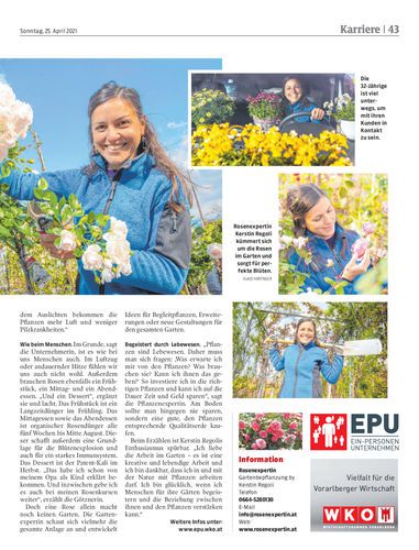 Rosen sind Lebewesen und spiegeln, wie sie behandelt werden. Doch eigentlich sind sie unaufwendig, erklärt Rosen- und Pflanzenexpertin und EPU Kerstin Regoli aus Götzis. Sie kommt in Privat- und Firmengärten und plant, schneidet, setzt und pflegt weit mehr als Rosen.