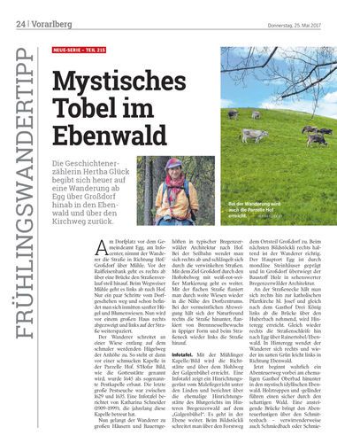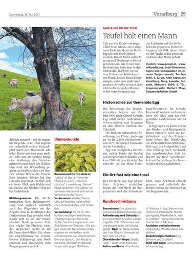 Die Geschichtenerzählerin Hertha Glück begibt sich heuer auf eine Wanderung ab Egg über Großdorf hinab in den Ebenwald und über den Kirchweg zurück.
