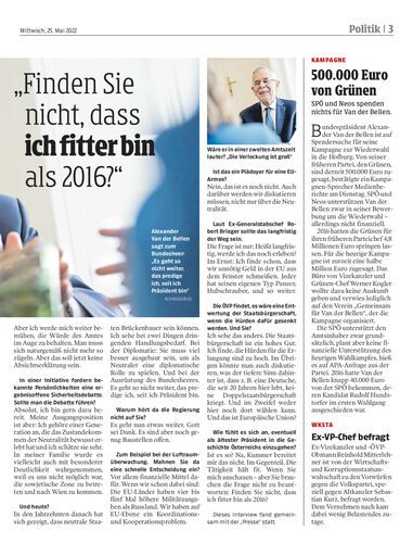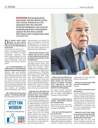 Bundespräsident Alexander Van der Bellen strebt eine zweite Amtszeit an. Ein Gespräch über die aktuelle Sicherheitsdebatte, eine erneute Angelobung Kickls und darüber, warum für ihn Ibiza und die ÖVP-Chats nicht vergleichbar sind. Von Christina Traar
