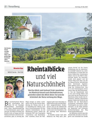 Hertha Glück und Gerhard Vylet spazieren im Rheintal hinauf nach Buchebrunnen, genießen dabei den Blick übers Tal und die Schönheit der Natur entlang des Wegs.