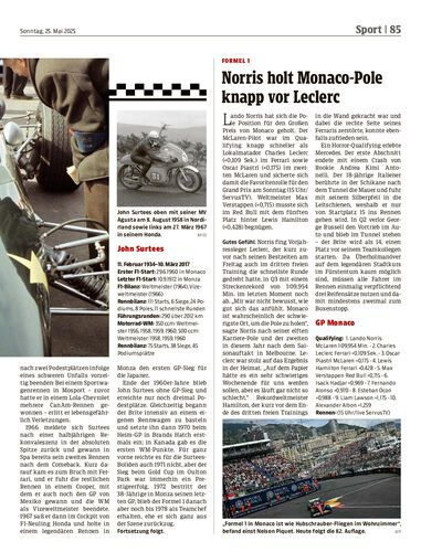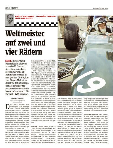 Serie. Die Formel 1 bestreitet in diesem Jahr die 75. Saison. Aus diesem Anlass stellen wir jedes F1-Rennwochenende einen großen Champion vor. Dieses Mal ist es der Brite John Surtees, der als einziger Motorsportler sowohl die Motorrad- als auch die Formel-1-WM gewann.