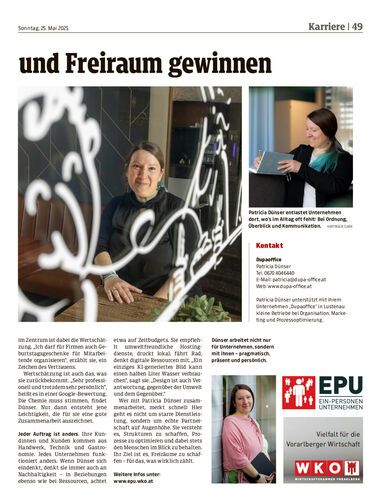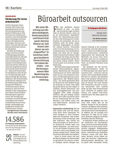 Mit einer Mischung aus Bodenständigkeit, Professionalität und Kreativität packt Patricia Dünser an. Seit einem Jahr bietet sie mit „Dupaoffice“ in Lustenau maßgeschneiderte Unterstützung für kleine Betriebe – von Rechnungswesen über Marketing bis zur Prozessoptimierung.