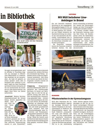 Mehr als 80 Menschen versammelten sich am Montagabend vor der Bibliothek in Götzis. Dort las Umweltaktivistin und Gemeindepolitikerin Marina Hagen-Canaval aus ihrem Buch „Widerstand“, nachdem die geplante Lesung von der Volkshochschule abgesagt worden war.
