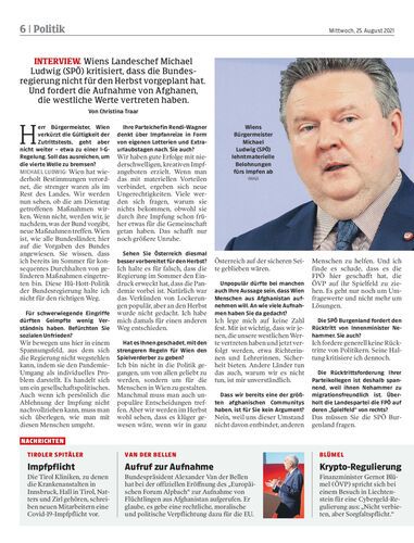 Wiens Landeschef Michael Ludwig (SPÖ) kritisiert, dass die Bundesregierung nicht für den Herbst vorgeplant hat. Und fordert die Aufnahme von Afghanen, die westliche Werte vertreten haben. Von Christina Traar