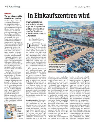 Impfangebot wird noch niederschwelliger. Ab 3. September gibt es „Pop-up-Impfstraßen“ im Messe- und Zimbapark und in Altenstadt.