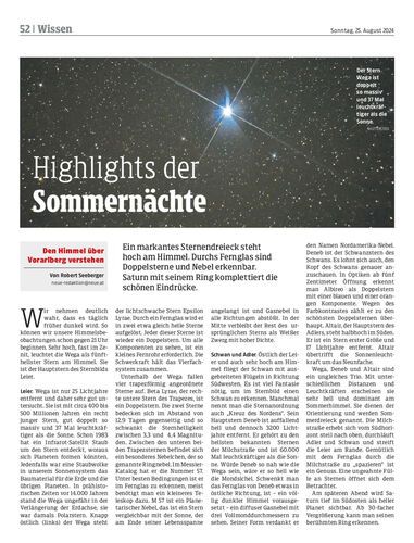 hoch am Himmel. Durchs Fernglas sind Doppelsterne und Nebel erkennbar. Saturn mit seinem Ring komplettiert die schönen Eindrücke.