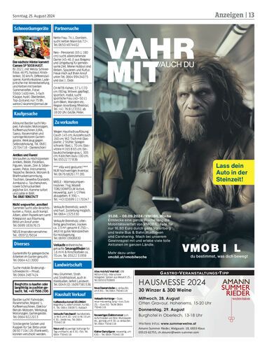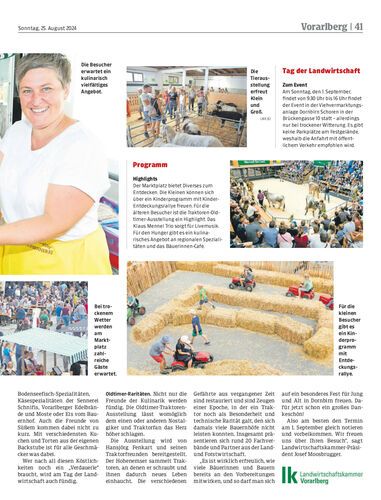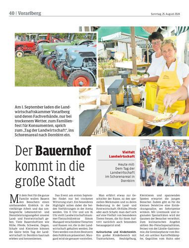 Am 1. September laden die Landwirtschaftskammer Vorarlberg und deren Fachverbände, nur bei trockenem Wetter, zum Familienfest für Konsumenten, sprich zum „Tag der Landwirtschaft“, ins Schorenareal nach Dornbirn ein.