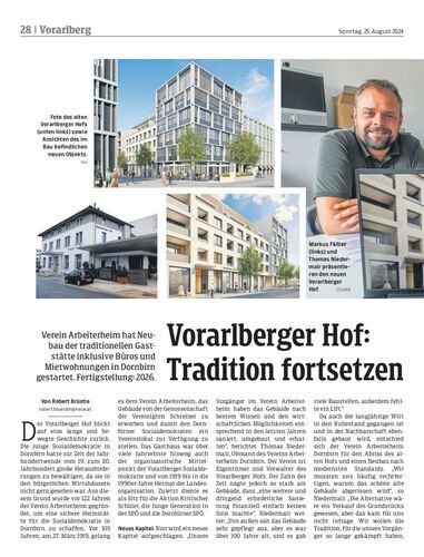 Verein Arbeiterheim hat Neubau der traditionellen Gaststätte inklusive Büros und Mietwohnungen in Dornbirn gestartet. Fertigstellung: 2026.