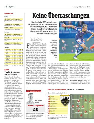 Bundesligist SCR Altach empfängt heute (18.30 Uhr) Aufsteiger Austria Klagenfurt. Auch wenn Damir Canadi erstmals auf die Kärntner trifft, erwartet er sich keine Überraschungen.