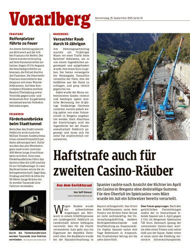 Spanier raubte nach Ansicht der Richter im April im Casino in Bregenz eine dreistellige Summe. Für den Überfall im Spielcasino vom März wurde im Juli ein Schweizer bereits verurteilt.
