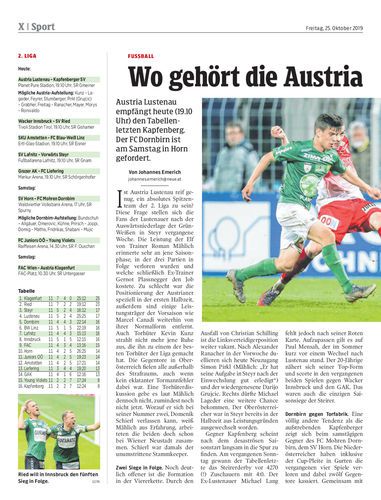 Austria Lustenau empfängt heute (19.10 Uhr) den Tabellenletzten Kapfenberg. Der FC Dornbirn ist am Samstag in Horn gefordert.