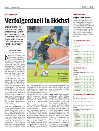 Der drittplatzierte FC Höchst empfängt am Samstag (15 Uhr) den Tabellennachbarn FC Schruns. Im Bizauer Bergstadion können sich die Hausherren zum Herbstmeister küren.