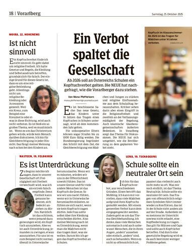 Ab 2026 soll an Österreichs Schulen ein Kopftuchverbot gelten. Die NEUE hat nachgefragt, wie die Vorarlberger dazu stehen.