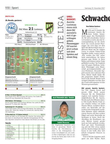 Spielbericht. Austria Lustenau muss sich dem FAC auswärts mit 1:2 geschlagen geben. Plassnegger-Elf wartet jetzt schon seit drei Spielen auf einen Sieg.