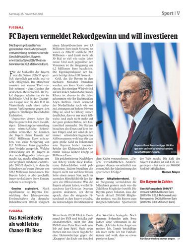 Die Bayern präsentierten gestern bei ihrer Jahreshauptversammlung beeindruckende Geschäftszahlen. Bayern erwirtschaftete 2016/17 einen Gewinn von 39,2 Millionen Euro.