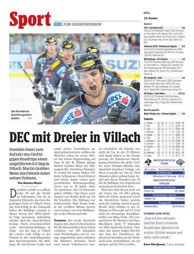 Dornbirn feiert zum Auftakt des fünftägigen Roadtrips einen ungefährten 6:3-Sieg in Villach. Martin Grabher Meier durchbrach dabei seinen Torbann.