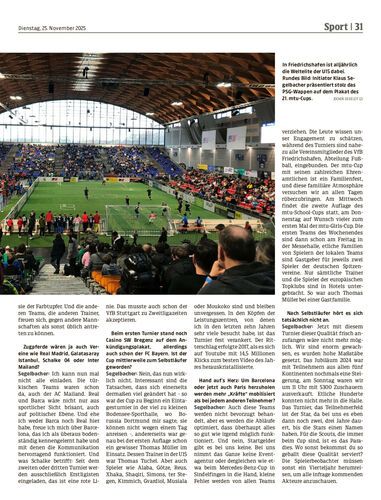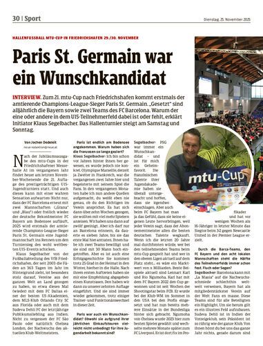 Interview. Zum 21. mtu-Cup nach Friedrichshafen kommt erstmals der amtierende Champions-League-Sieger Paris St. Germain. „Gesetzt“ sind alljährlich die Bayern sowie zwei Teams des FC Barcelona. Warum der eine oder andere in dem U15-Teilnehmerfeld dabei ist oder fehlt, erklärt Initiator Klaus Segelbacher. Das Hallenturnier steigt am Samstag und Sonntag.
