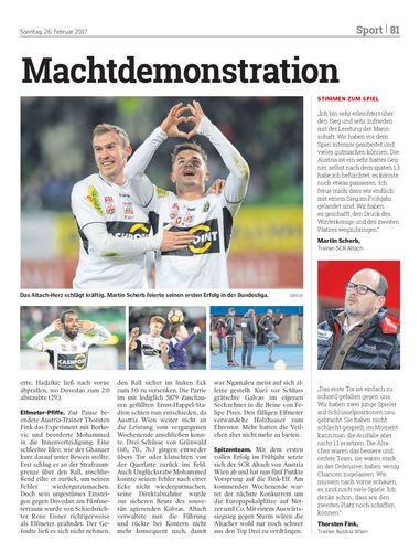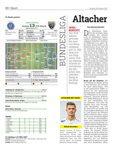 Spielbericht. Der SCR Altach gewinnt bei Austria Wien verdient mit 3:1. Mit dem ersten Sieg unter Trainer Martin Scherb zementieren die Altacher den zweiten Rang in der Bundesliga.